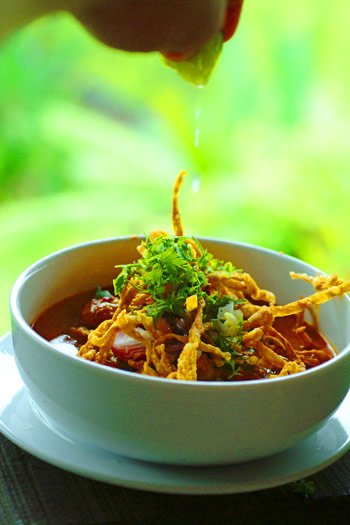 Kao soi kai, Northern Thai noodles with chicken and coconut gravy.
