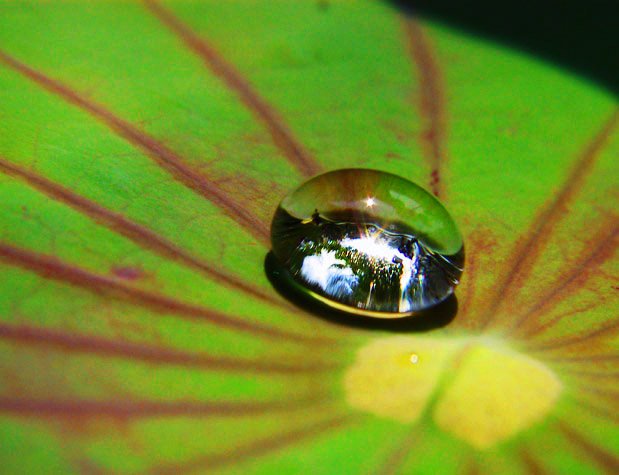The Singapore Botanic Gardens, reflected in a water droplet on a lily pad.